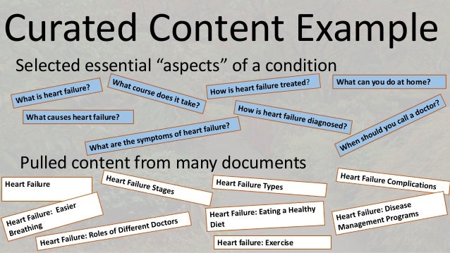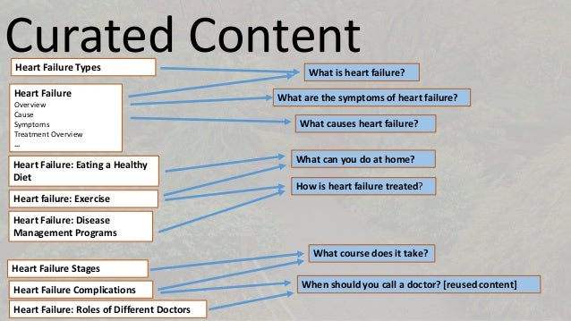 - 11. Curated ContentWhat is heart failure? What course does it take? What causes heart failure? What can you do at home? When should you call a doctor? [reused content] How is heart failure treated? What are the symptoms of heart failure?Heart Failure Overview Cause Symptoms Treatment Overview … Heart Failure Stages Heart Failure: Roles of Different Doctors Heart Failure Types Heart Failure: Eating a Healthy Diet Heart failure: Exercise Heart Failure Complications Heart Failure: Disease Management Programs