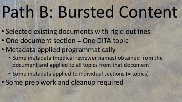 - 13. Path B: Bursted Content • Selected existing documents with rigid outlines • One document section = One DITA topic • Metadata applied programmatically • Some metadata (medical reviewer names) obtained from the document and applied to all topics from that document • Some metadata applied to individual sections (= topics) • Some prep work and cleanup required