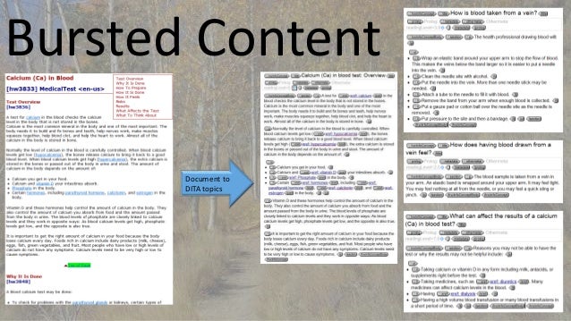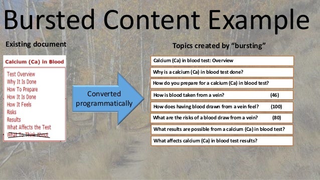 - 14. Bursted Content Example Converted programmatically Calcium (Ca) in blood test: Overview Why is a calcium (Ca) in blood test done? How do you prepare for a calcium (Ca) in blood test? How is blood taken from a vein? (46) How does having blood drawn from a vein feel? (100) What are the risks of a blood draw from a vein? (80) What results are possible from a calcium (Ca) in blood test? What affects calcium (Ca) in blood test results? Existing document Topics created by “bursting”