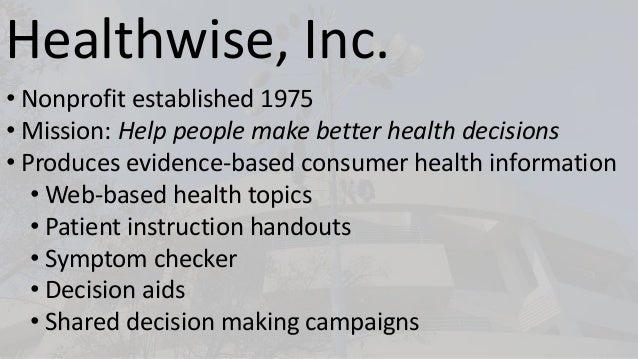 - 2. Healthwise, Inc. • Nonprofit established 1975 • Mission: Help people make better health decisions • Produces evidence-based consumer health information • Web-based health topics • Patient instruction handouts • Symptom checker • Decision aids • Shared decision making campaigns