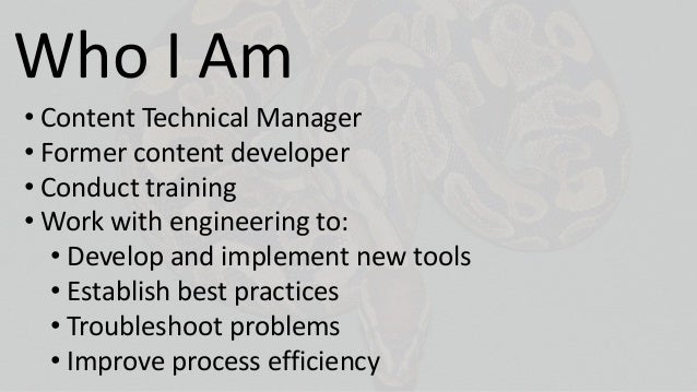 - 3. Who I Am • Content Technical Manager • Former content developer • Conduct training • Work with engineering to: • Develop and implement new tools • Establish best practices • Troubleshoot problems • Improve process efficiency