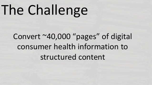 - 4. The Challenge Convert ~40,000 “pages” of digital consumer health information to structured content