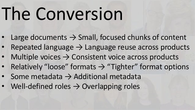- 5. The Conversion • Large documents → Small, focused chunks of content • Repeated language → Language reuse across products • Multiple voices → Consistent voice across products • Relatively “loose” formats → “Tighter” format options • Some metadata → Additional metadata • Well-defined roles → Overlapping roles