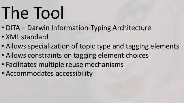 - 6. The Tool • DITA – Darwin Information-Typing Architecture • XML standard • Allows specialization of topic type and tagging elements • Allows constraints on tagging element choices • Facilitates multiple reuse mechanisms • Accommodates accessibility