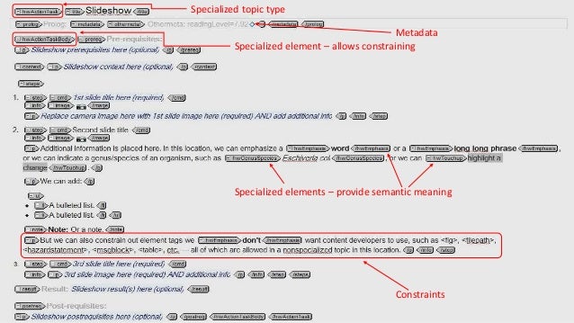 - 7. Metadata Specialized topic type Specialized element – allows constraining Specialized elements – provide semantic meaning Constraints