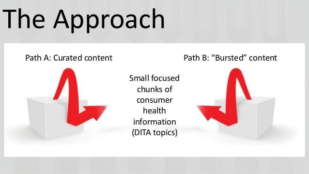 - 8. The Approach Path A: Curated content Path B: “Bursted” content Small focused chunks of consumer health information (DITA topics)