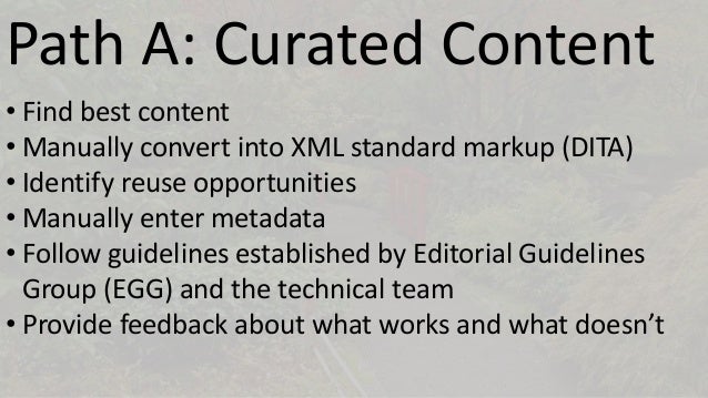 - 9. Path A: Curated Content • Find best content • Manually convert into XML standard markup (DITA) • Identify reuse opportunities • Manually enter metadata • Follow guidelines established by Editorial Guidelines Group (EGG) and the technical team • Provide feedback about what works and what doesn’t